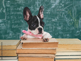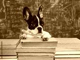 Cute puppy and old books on chalkboard background. Close-up, studio shot, day light. Concept of care, education, obedience training and raising of pets