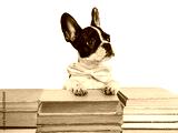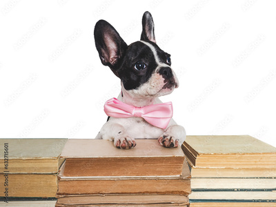 Cute puppy and vintage books. Close-up, isolated background. Studio shot, day light. Concept of care, education, obedience training and raising of pets