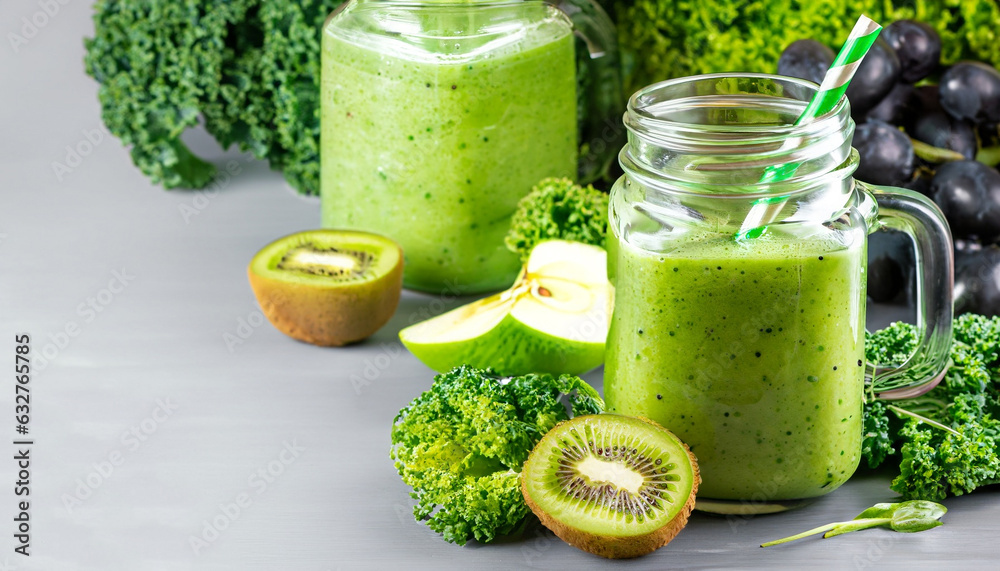 Glass jar mugs with green health smoothie, kale leaves, lime, apple, kiwi, grapes, banana, avocado, lettuce. Copy space. Raw, vegan, vegetarian, alkaline food concept. Banner.