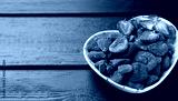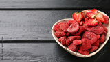 Freeze dried and fresh strawberries on black wooden table. Space for text