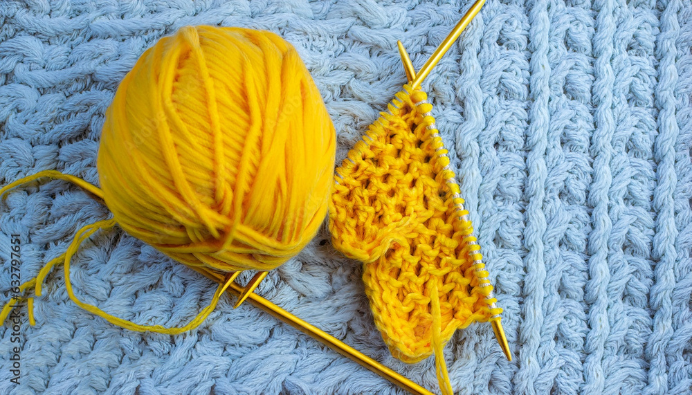 Vibrant yellow texture knitted wool scarf. Yellow textile background knitwear. Close-up