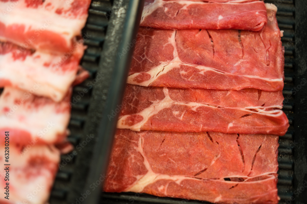 Fresh beef raw sliced with marbled texture served on black tray for Sukiyaki and Shabu