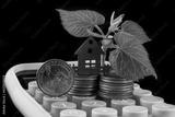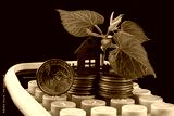 A young sprout with green leaves, US coins, a calculator and a symbolic wooden house on a black background
