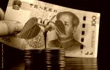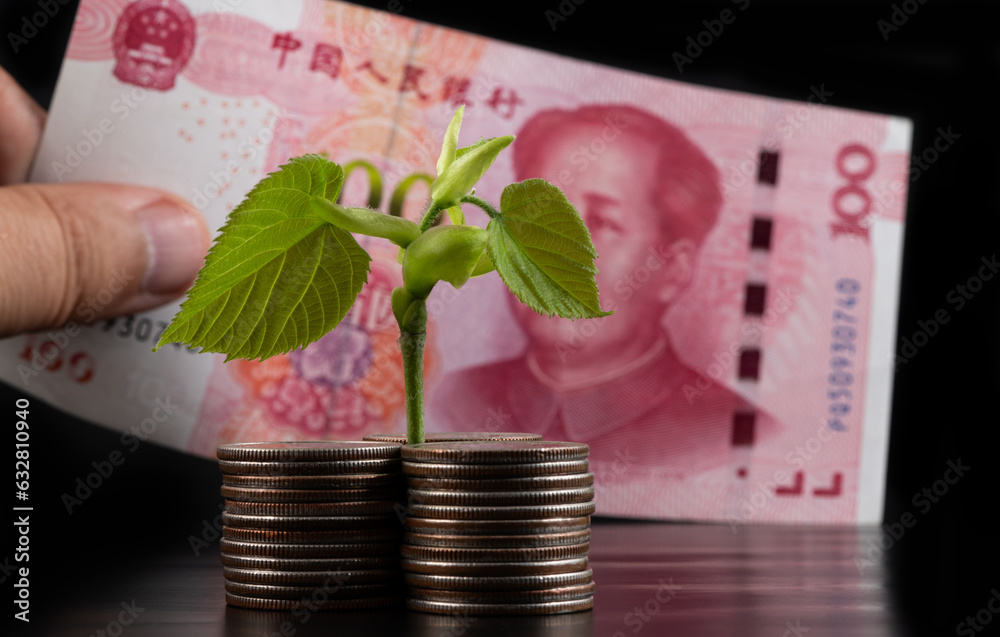 Young sprout with green leaves and 100 Chinese yuan banknote