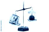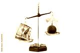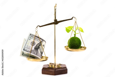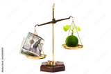 A young sprout with green leaves, a miniature green planet and a 100 US dollar bill on the scales on a white background