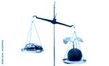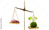 A symbolic green planet with a young sprout on one side of the scale and a conditional miniature car on the other side of the scale