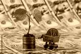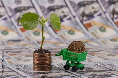 A young sprout with green leaves and a 1 american dollar coin against the background of 100 us dollar bills