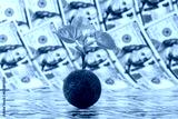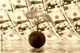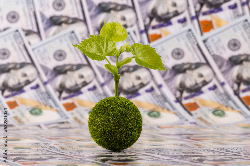 A miniature green planet and a young sprout with green leaves against the backdrop of 100 american dollar bills