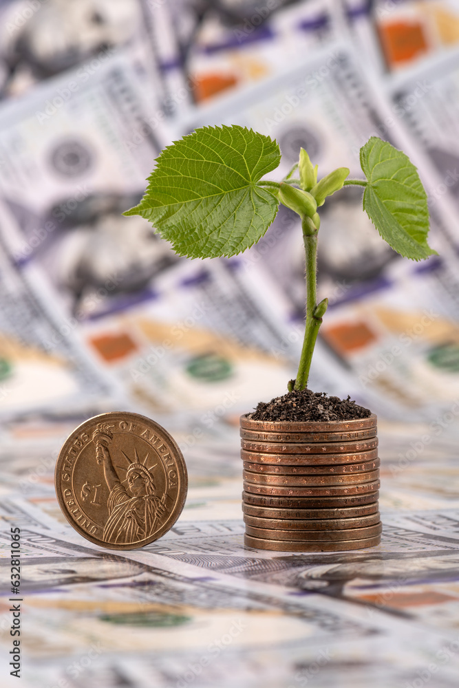 A young sprout with green leaves and a 1 american dollar coin against the background of 100 us dollar bills