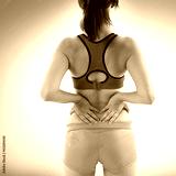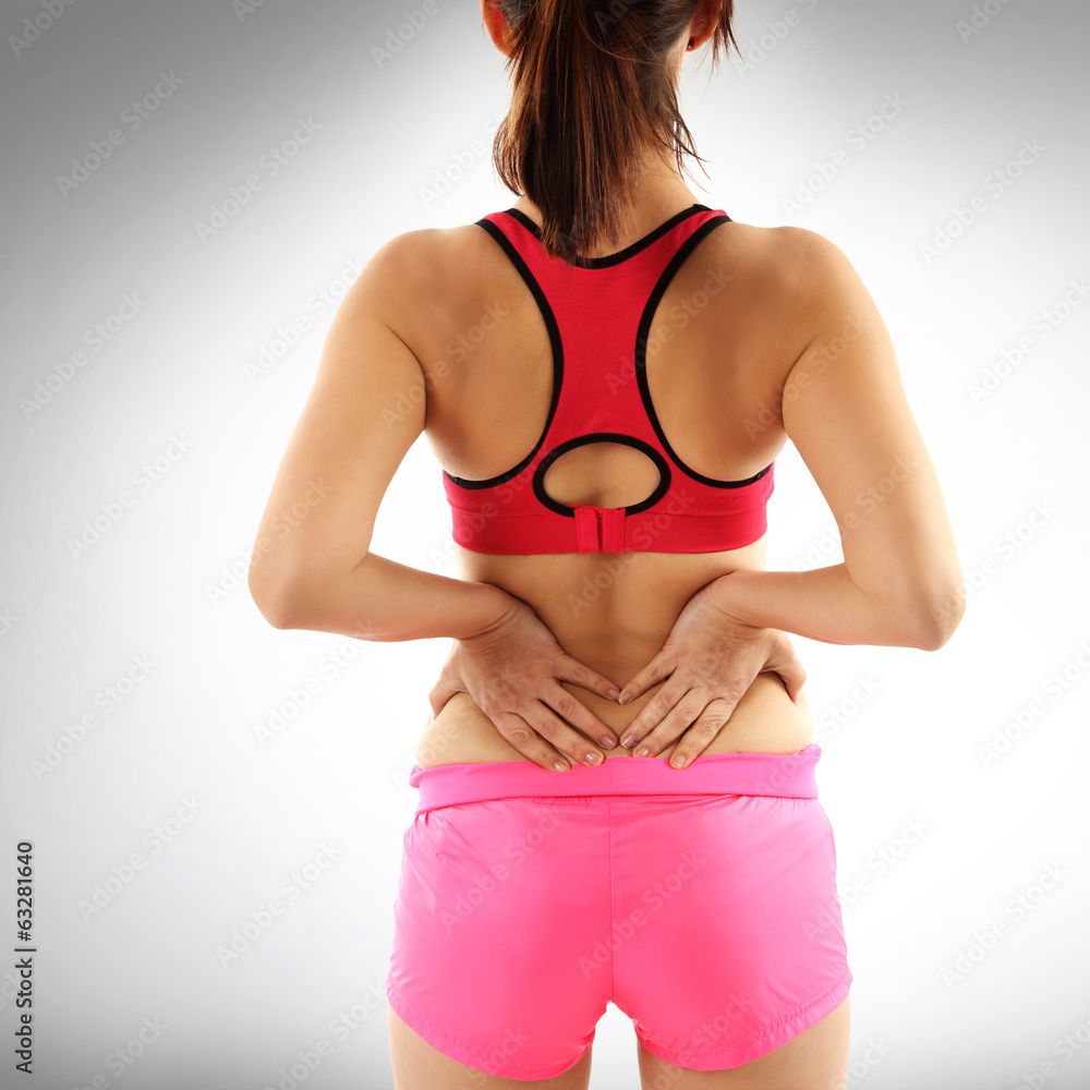 A young woman in sportswear standing backwards and holding her hands on her back indicating back pain