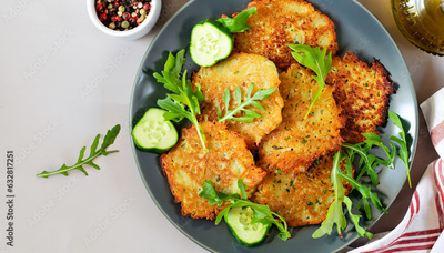 Potato pancakes are Belarusian dishes that are also popular in Ukrainian, Russian, Eastern European and Jewish cuisine. Served with lettuce, arugula, cucumber and olives. Top view. Flat lay. Banner