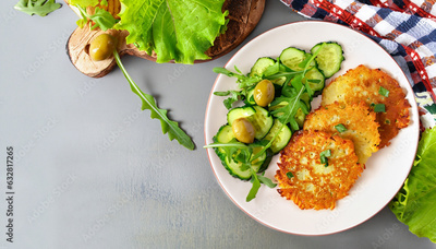 Potato pancakes are Belarusian dishes that are also popular in Ukrainian, Russian, Eastern European and Jewish cuisine. Served with lettuce, arugula, cucumber and olives. Top view. Flat lay. Banner