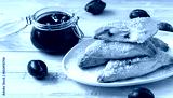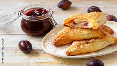 Msemmen - traditional Moroccan puff pastries with plum jam on a light wooden table.