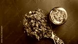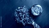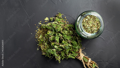 Dried peppermint in a glass jar and a bunch of fresh mint, medicine herb on black background, top view