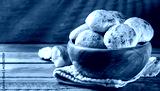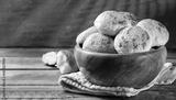 Cheese buns in wooden bowl, rustic kitchen table background, copy space, selective focus