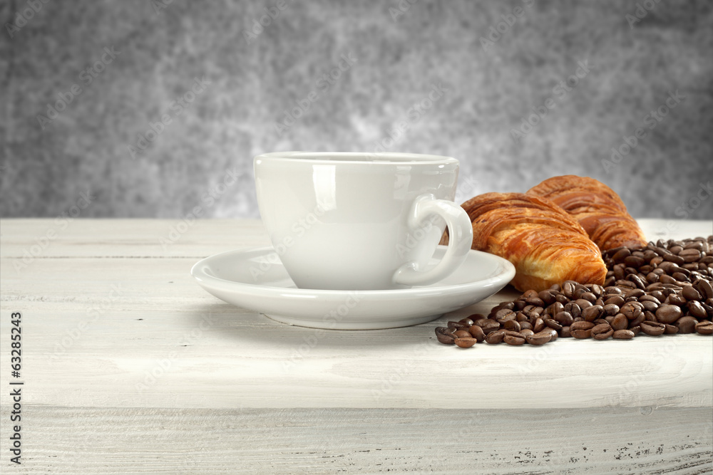 A white cup of hot coffee and croissants and scattered coffee beans on a table with a light gray grunge wall background.