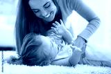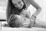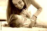 Loving mother playing with little girl on carpet