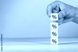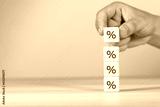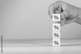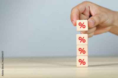 Financial interest rate holding wooden block with percentage sign and up arrow, financial growth, interest rate increase, inflation rate, selling price and tax hike concept and rate simulation