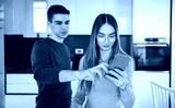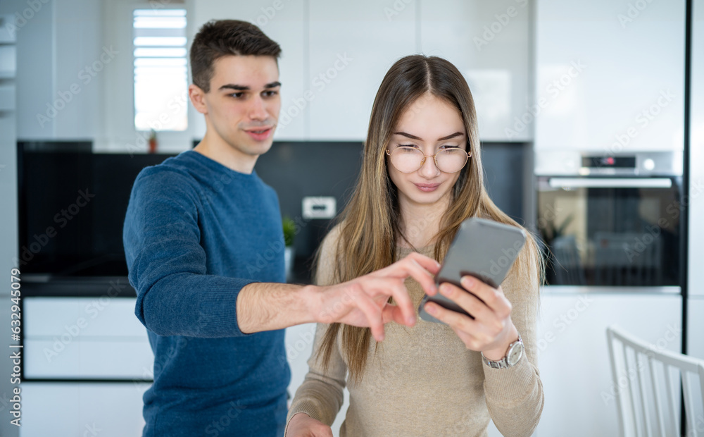 Teenage boy showing something on smartphone to his girlfriend while standing together at kitchen at home.