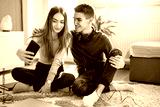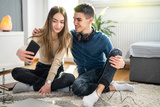 Teenage couple taking a selfie photo while sitting together on the floor at home.
