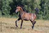 Young pretty arabian horse runs and frolics summer background