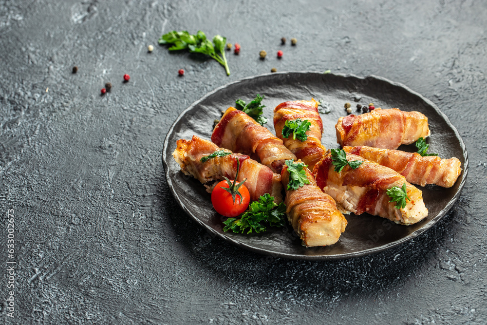 bacon wrapped chicken nuggets, Restaurant menu, dieting, cookbook recipe top view