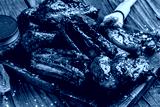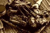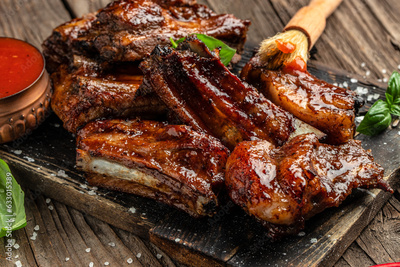 pork ribs grilled with BBQ sauce on a wooden board. Healthy fats, clean eating for weight loss. top view. place for text
