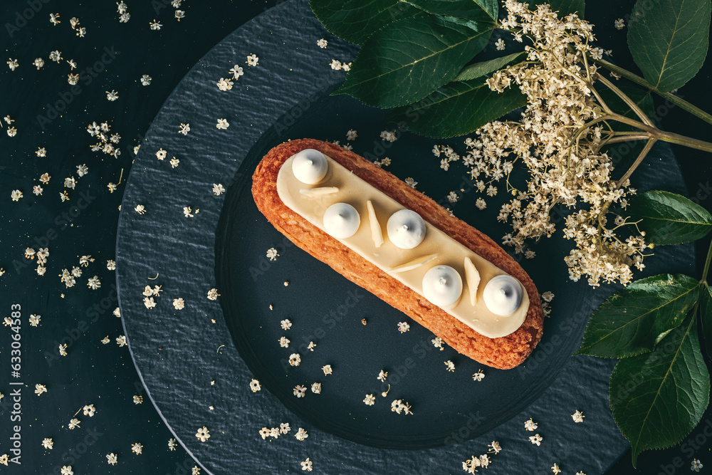 French eclair grazed with chocolate or sweet Italian profiteroles on a black stone plate, gourmet confectionery food