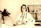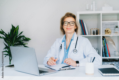 Successful mature caucasian senior female doctor in white coat using laptop for telemedicine with patients at hospital. GP make online video call consult patient. Online remote medical appointment.