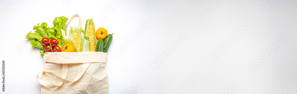 Vegetarian grocery shopping. Different fresh vegetables in a textile shopper bag on white background, healthy vegan food from supermarket or delivery concept, copy space.