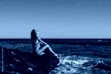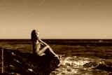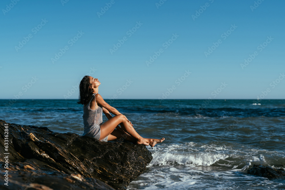 beautiful brunette girl in a silvery net stands on the stones on the seashore