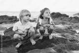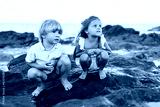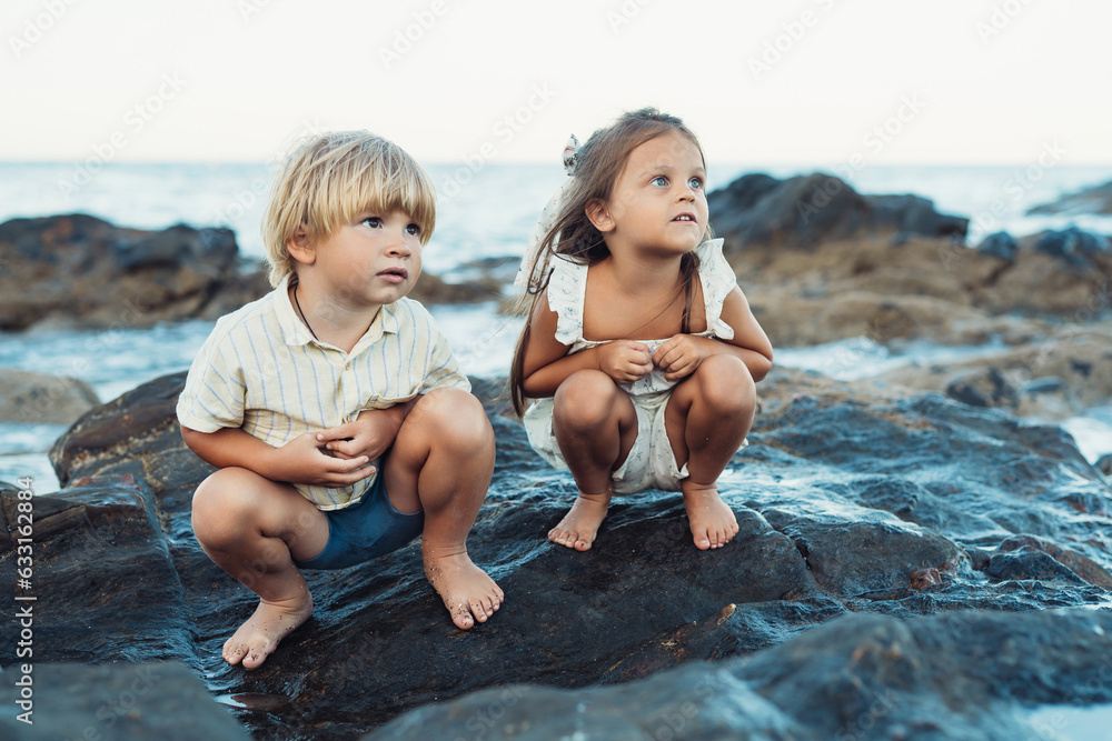 blond boy and a brunette girl, three years old, are sitting on stones on the seashore