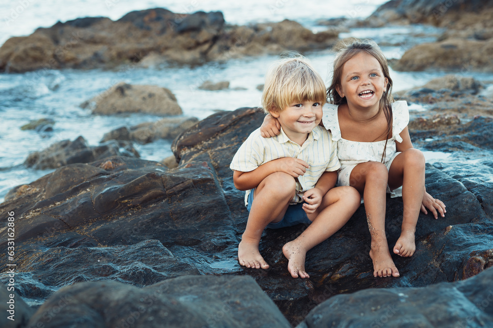 blond boy and a brunette girl, three years old, are sitting on stones on the seashore