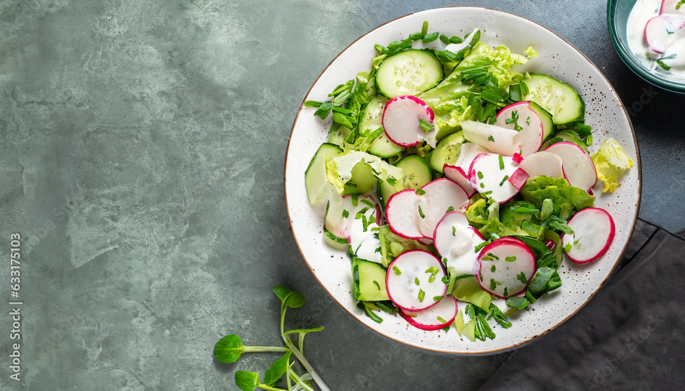 Healthy crispy salad with radishes, cucumbers, lettuce and chives with yogurt dressing, green stone table background, top view