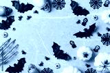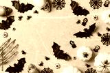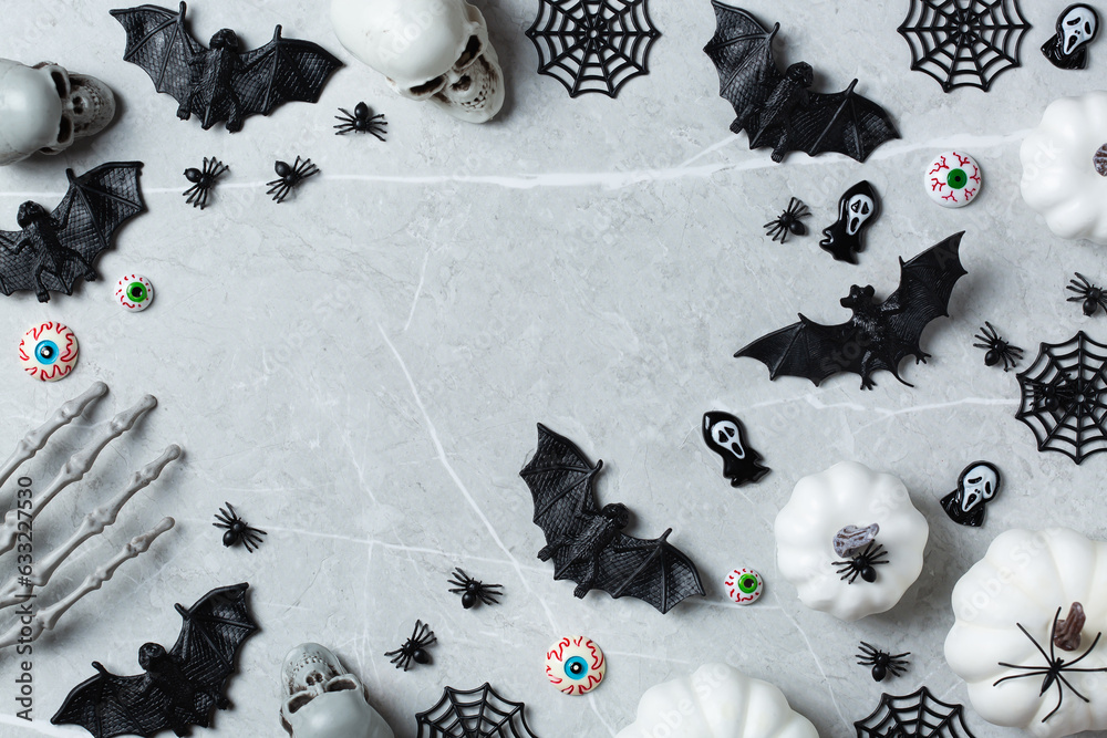 Halloween greeting card with pumpkin, skulls, bony hands and spiders