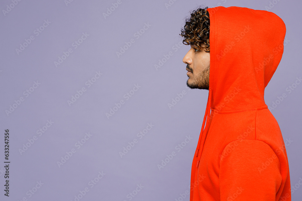 Side view young unshaven cool serious student Indian man in hood wear red orange hoody casual clothes look camera isolated on plain pastel light purple color wall background studio. Lifestyle concept.