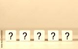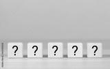 Question mark, Confused, Thinking, Brainstorming or Decision, Problem Solving, Finding Answer, Question. Marked words in wooden blocks on table top.