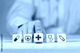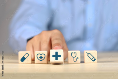Wooden block with concept of health care, medical icons