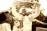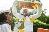 Girl holding smoker while male apiarist analyzing honeycomb frame