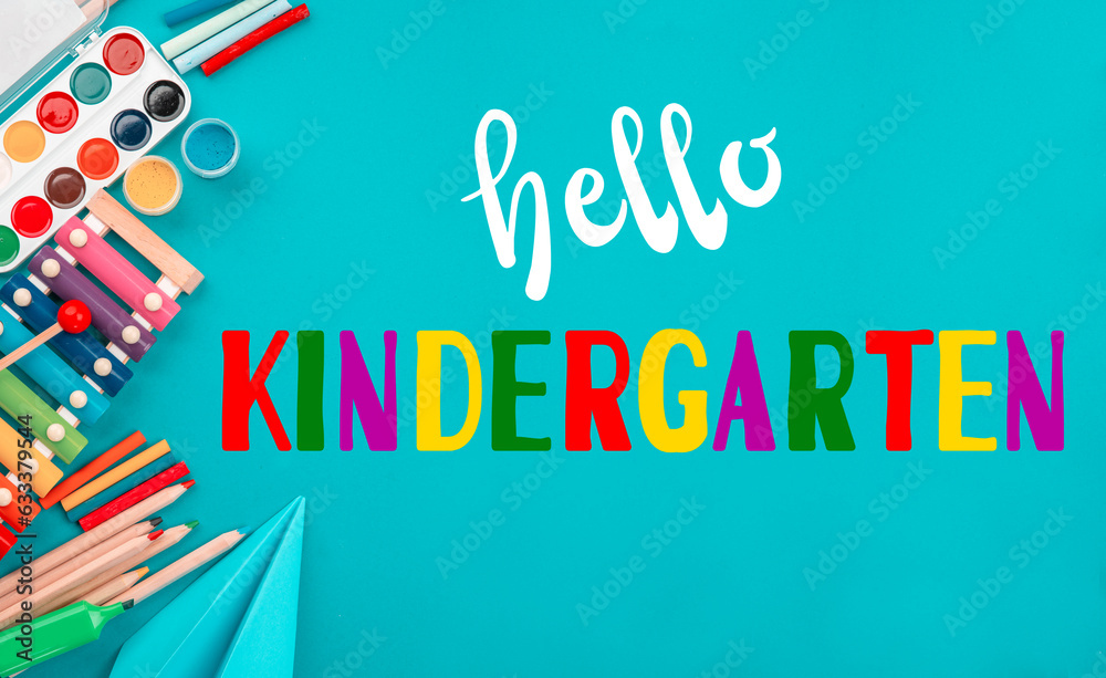 Hello kindergarten background. Top view flat lay concept. Childish lettering, colored paper, supplies, stationery for Pre-school, nursery school, kindergarten or preschool educational