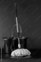 Cleaning concept mop and bucket. Cleaning products and spin mop with red details on the floor in the grey-black background