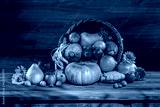 Thanksgiving day still life, background with empty copy space. Pumpkin harvest in wicker basket. Squash, vegetable autumn fruit, apples, and nuts on a wooden table. Halloween decoration fall design