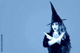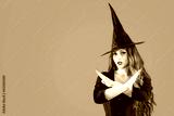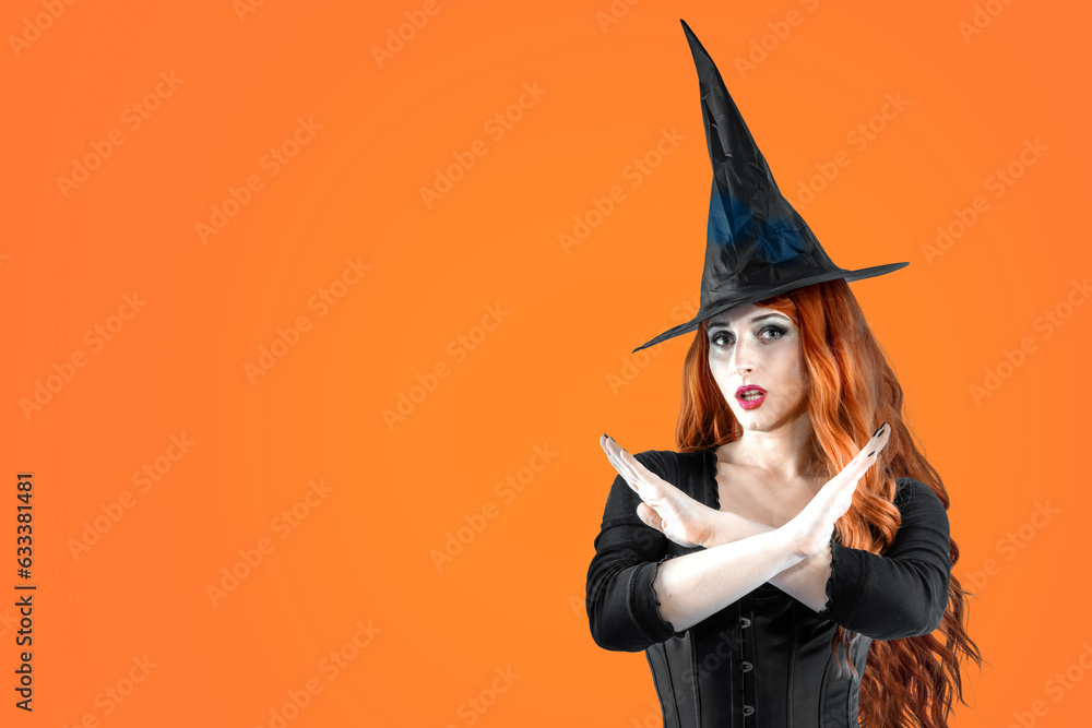 Witch on Halloween gesturing NO, disagreement, refusal. Female wizard fairy character Fantasy gothic red-haired Vampire girl in black dress.