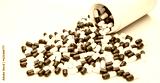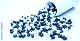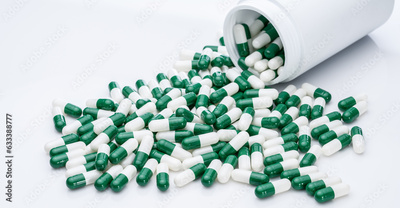 Green and white capsule pills spilled out of a white plastic bottle. Pharmaceutical industry. Prescription drug. Healthcare and medicine. Pharmacy product. Pharmaceutics. Capsule pill manufacture.