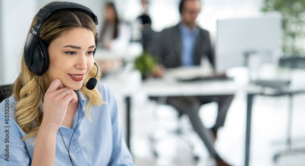 Portrait of female IT sector operator with headset working on computer in call center office.