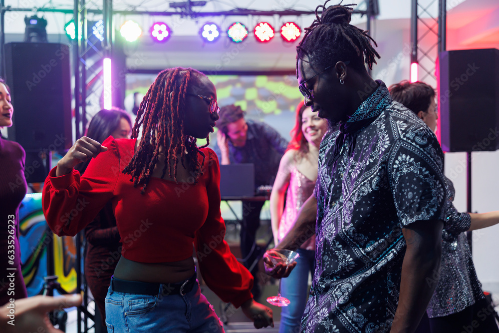 Young african american couple dancing and making moves to live music beats in crowded nightclub. Boyfriend and girlfriend dancers partying together on dancefloor in dark club