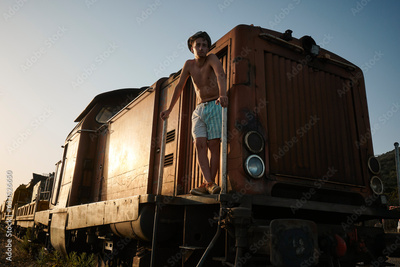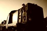 Solitary figure amidst abandoned setting, illuminated by vibrant sunset sky as train passes.