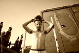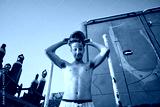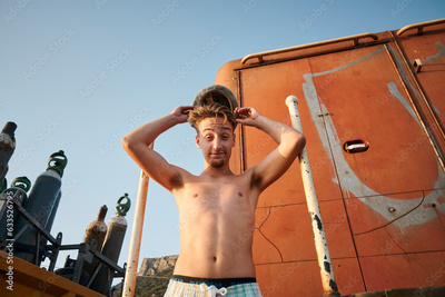 Low angle shoot of a young happy man wearing a hat in front of a train at sunset
