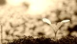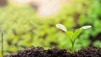 Green plant growing in good soil. Banner with copy space. Agriculture, organic gardening, planting or ecology concept. Young sprouts, seedlings growing. New life concept