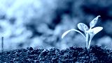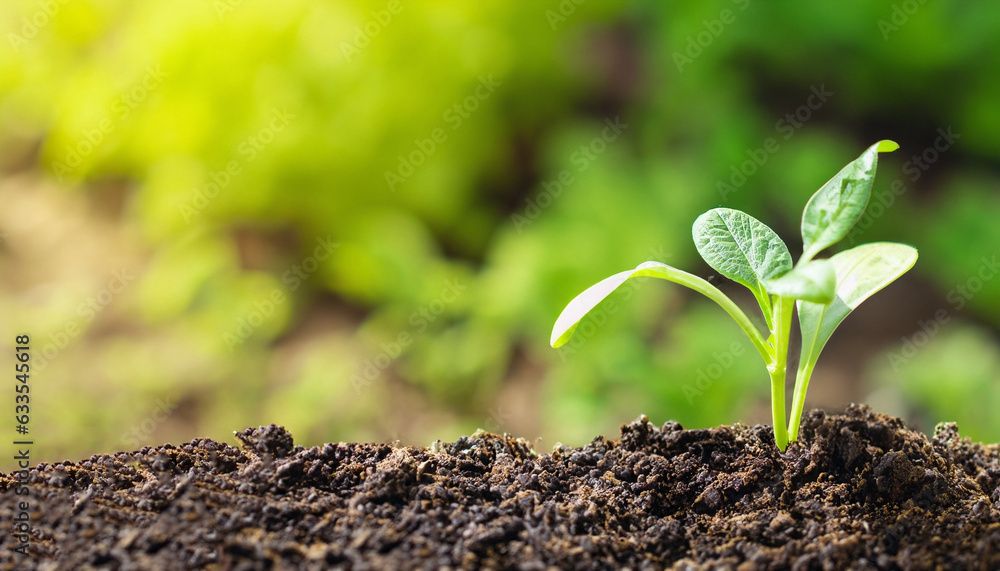 Green plant growing in good soil. Banner with copy space. Agriculture, organic gardening, planting or ecology concept. Young sprouts, seedlings growing. New life concept